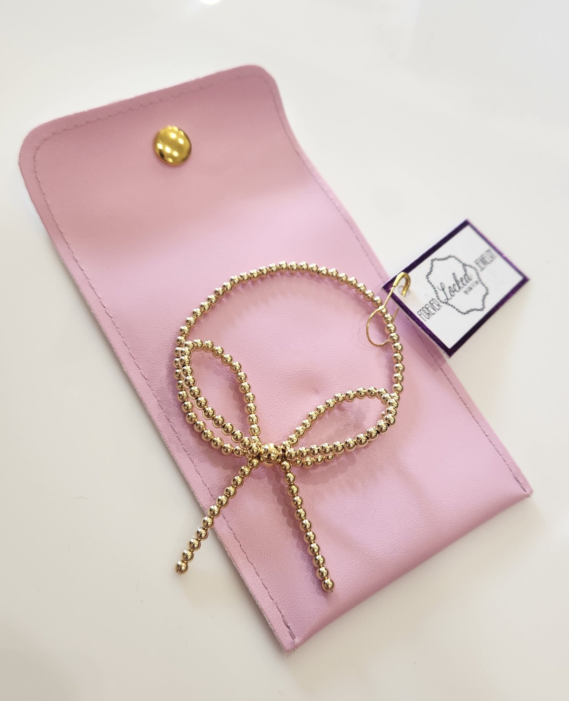 This classic 3mm beaded bow bracelet, available in 14k gold filled, features a delicate bow accent. Measuring 6.75", it is expertly hand-beaded in Houston, Texas, ensuring quality craftsmanship. Designed for everyday wear—including sweat, swimming, showering, and sleeping—this versatile piece can be worn alone or stacked for a personalized look. Durable and elegant, it combines timeless style with lasting comfort.