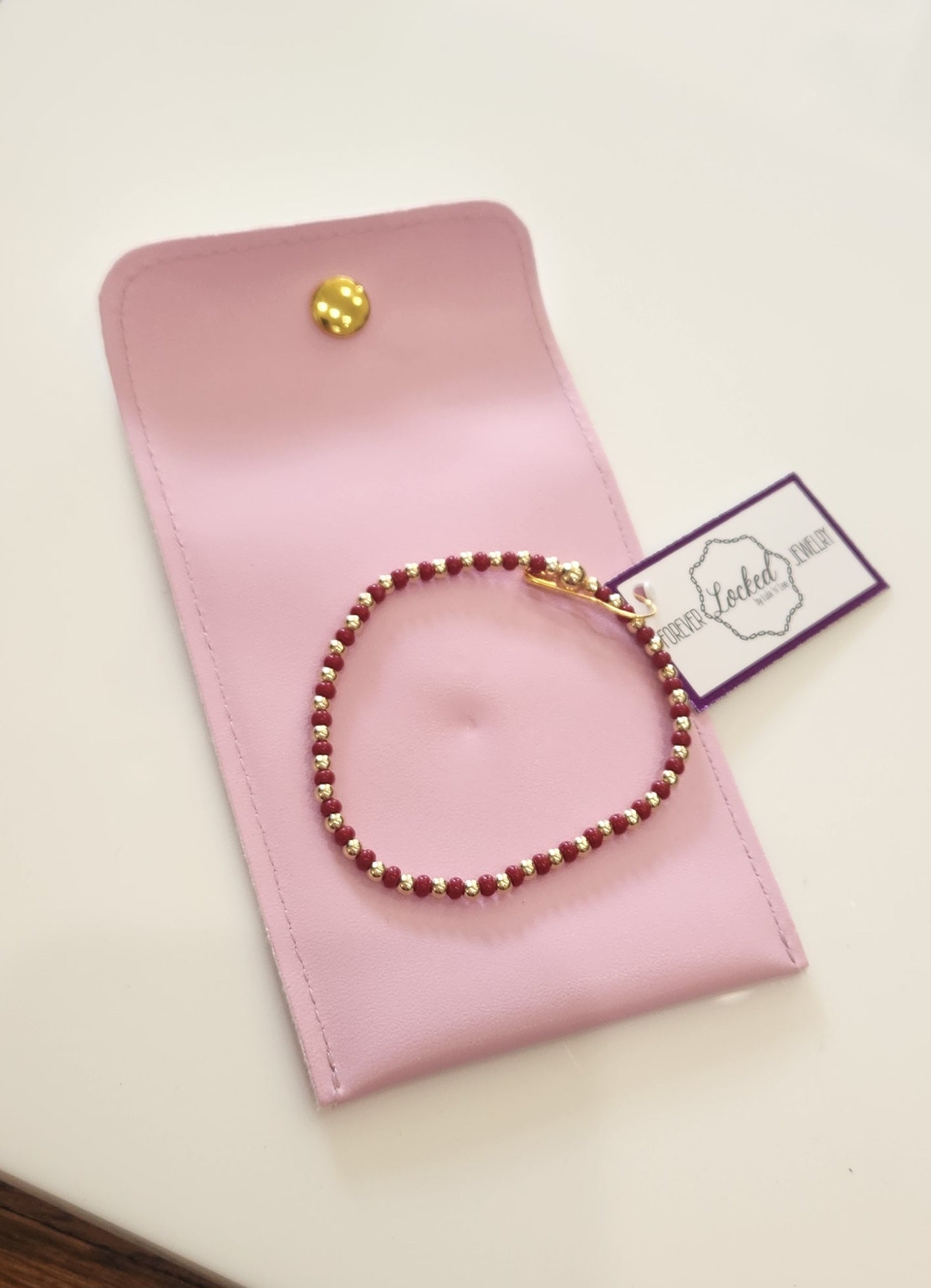 This classic 3mm 14k gold-filled beaded bracelet features vibrant Preciosa Ornela Crimson Czech glass beads, expertly hand-beaded in Houston, Texas. Measuring 6.75", it’s designed for everyday wear—whether you sweat, swim, shower, or sleep. Durable and elegant, it’s perfect to wear alone or stacked for a personalized look.