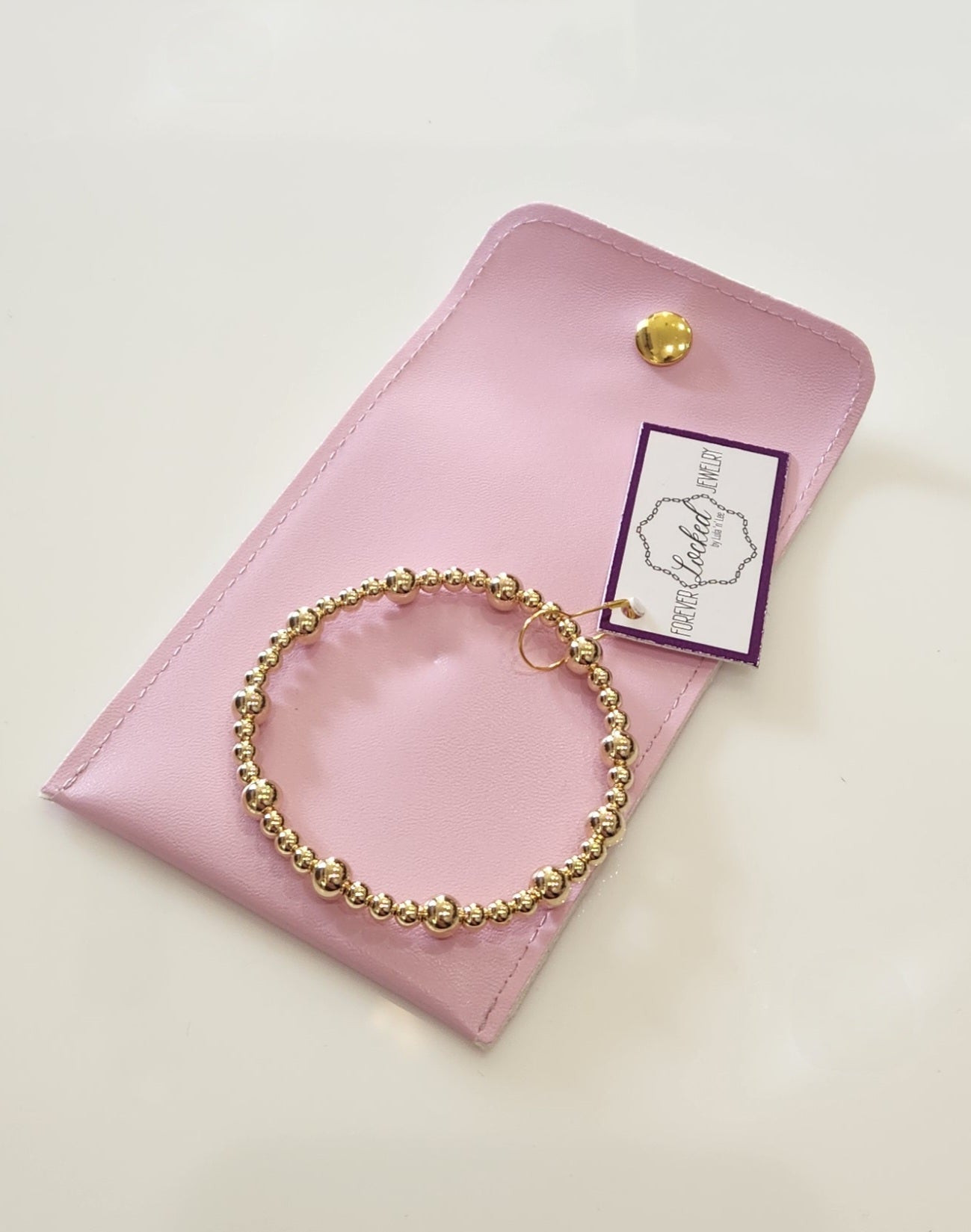 This handcrafted bracelet features alternating 4mm and 6mm beads in 14k gold-filled, measuring 6.75 inches for a comfortable fit. Designed for durability, it can be worn while sweating, swimming, showering, or sleeping without losing its shine. Expertly beaded in Houston, Texas, this versatile piece is perfect for stacking or wearing alone, combining timeless elegance with everyday resilience.