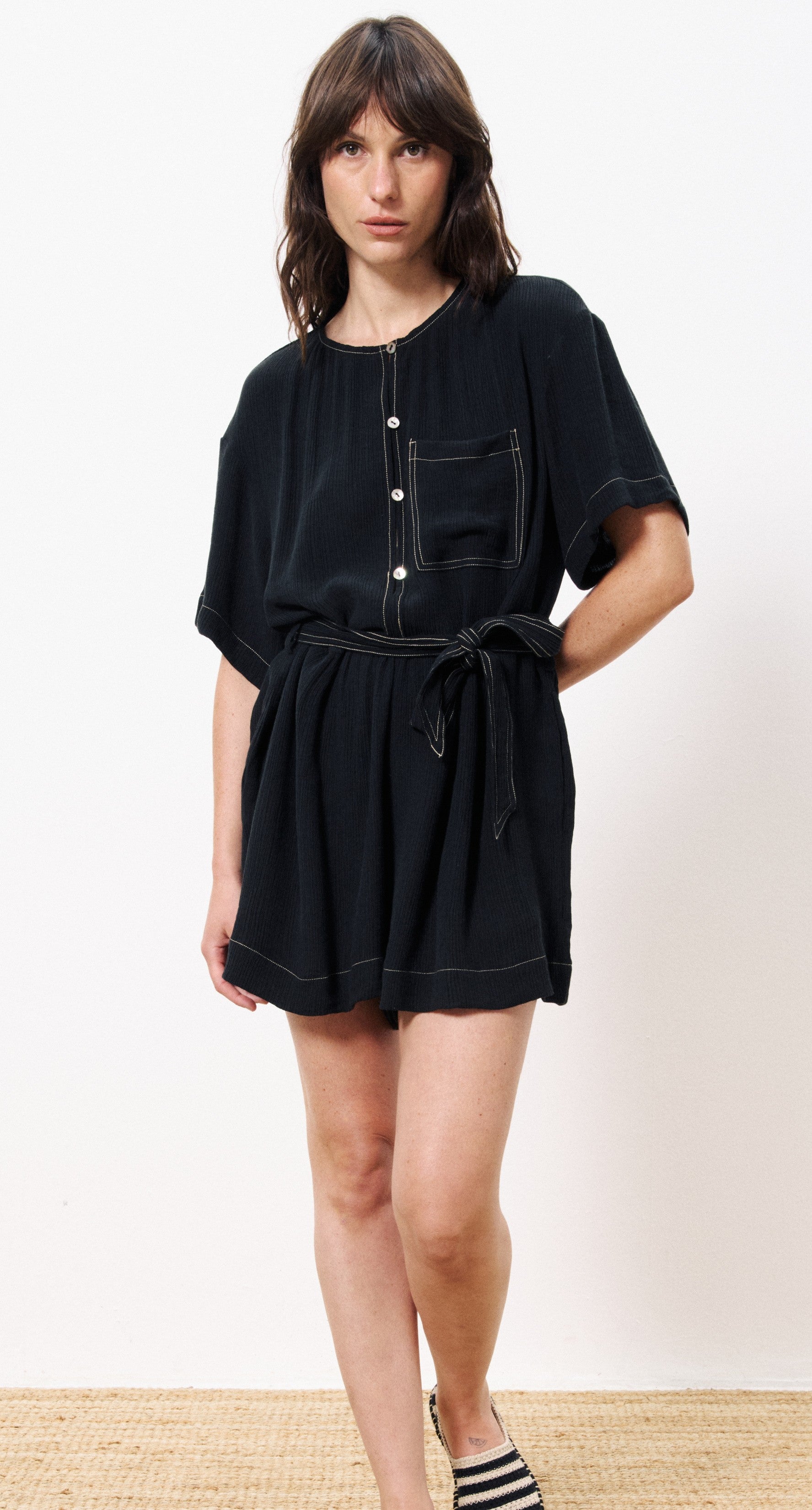 Get ready to turn heads in the LEILOO ROMPER - BLACK! This short jumpsuit is made from a fluid fabric, ensuring a comfortable and flattering fit. It features short sleeves, a Mao collar, and a chest pocket for added style. A removable belt ties it all together, giving you a versatile and chic look.