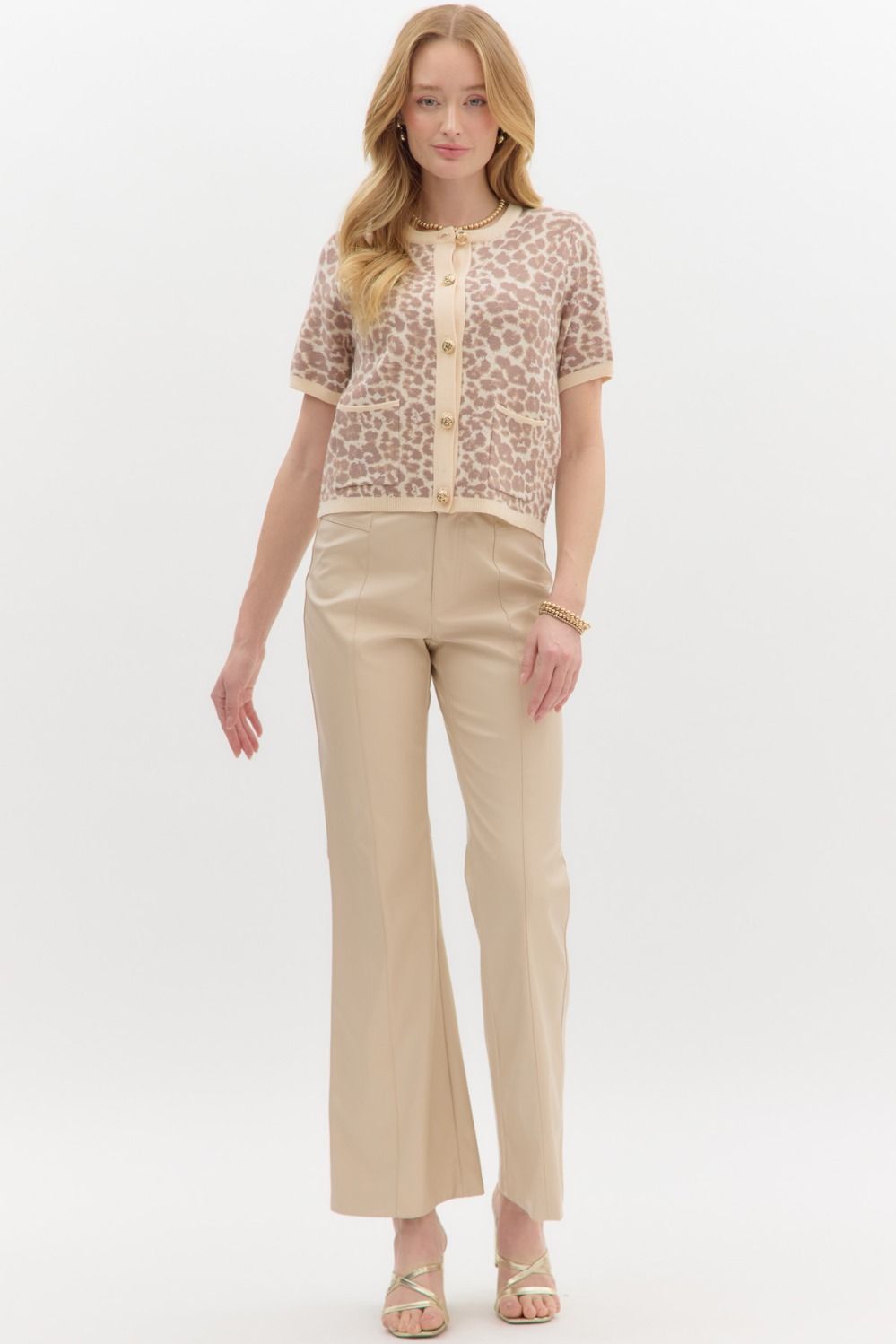 Enhance your wardrobe with the LEOPARD CARDI. This short sleeve sweater knit cardigan features a bold leopard pattern and accented gold button front closure for a touch of glamour. Made from quality knit material, it provides both comfort and style. Upgrade your look with this statement piece.