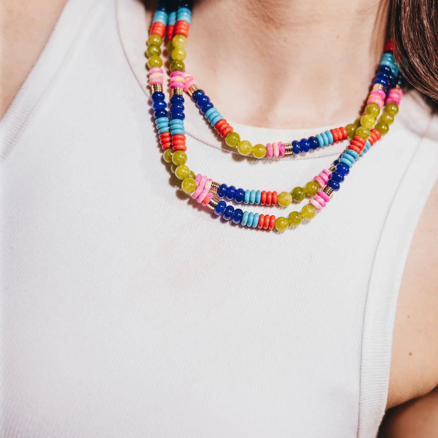 The Mirabella Necklace brings vibrant energy to your everyday style with its cheerful mix of green, blue, and red 8mm beads strung together in perfect harmony. This playful piece features a 3-inch extender, giving you the flexibility to adjust the fit for maximum comfort and versatility. Whether you're dressing up or keeping it casual, Mirabella adds a pop of color and personality to any outfit. Perfect for layering or wearing solo, this fun beaded necklace is ready to brighten your day.