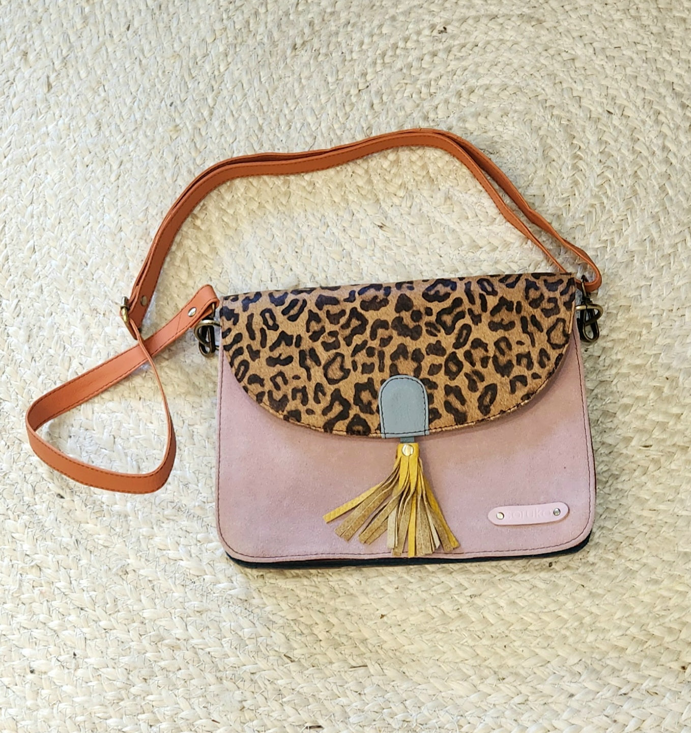 This Medium Crossbody Bag features an animal print and boasts 3 compartments with a magnetic closure. It also includes one zipper pocket inside. Made with suede leather and recycled materials, this handmade bag is the perfect size for travel and adds a touch of uniqueness to any outfit. We promise, this shoulder bag is pretty simple, but definitely one of a kind!