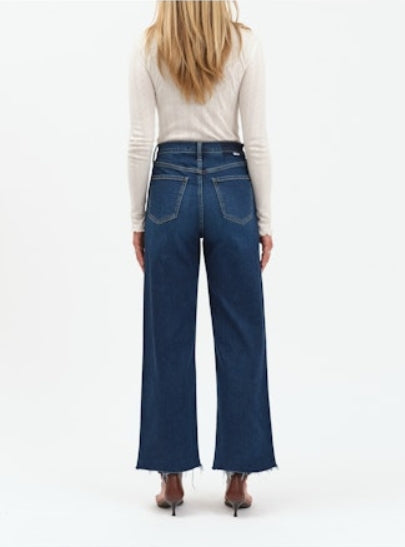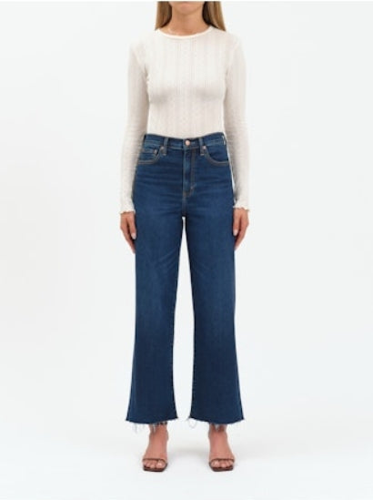 The Pleaser is our tried and true high rise wide ankle, featuring seaming details at the waist against an indigo blue wash with slight fading. This fit is constructed from our Hug denim, which is flexible enough to hug your body, yet heavy enough to cinch you in.
