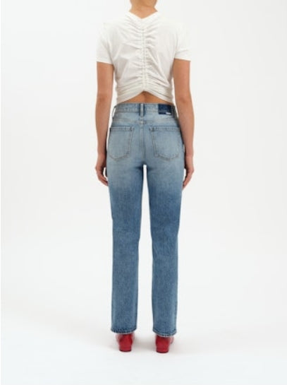 The Smarty Pants in Wink is a tried-and-true high rise slim fit jean. With its timeless light wash, clean hems, and close fit, this polished pair is perfect for your day-to-day. It's made of our Tough Love Fabric, with the perfect mix of rigid and stretch.